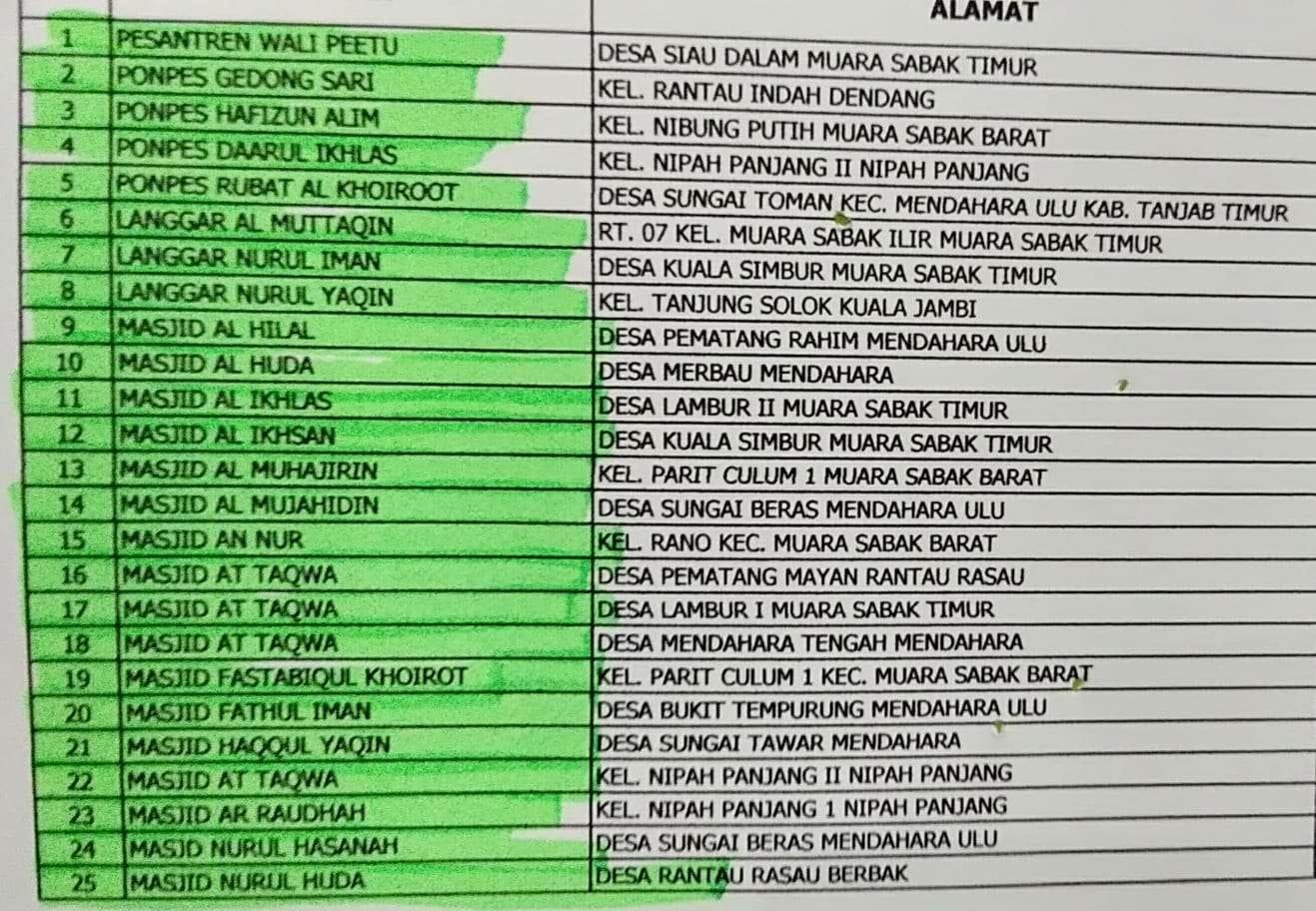 Daftar nama pondok pesantren dan rumah ibadah penerima bantuan di Tanjab Timur. (Foto Nahar)