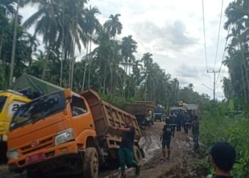 Rusak Parah Ruas Jalan Provinsi di Tanjab Timur Akibatnya Puluhan Truk Terjebak Kemacetan