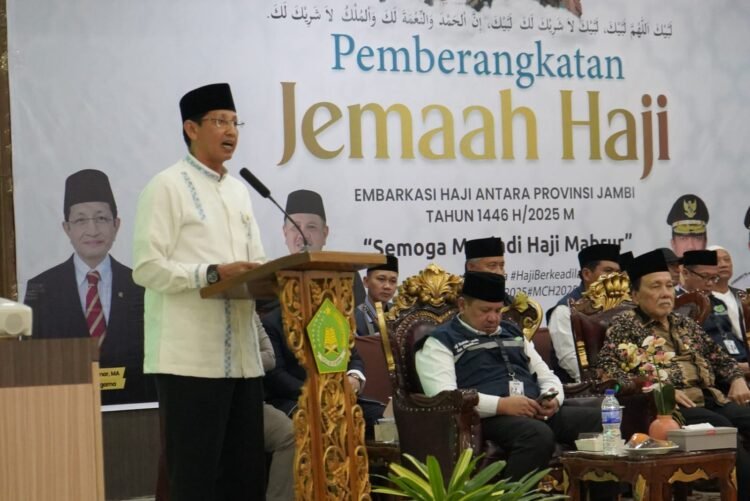 RJ.COM – Gubernur Jambi melalui Asisten II Sekda Provinsi Jambi Bidang Perekonomian dan Pembangunan, Johansyah, SE, ME, secara resmi melepas keberangkatan Jemaah Calon Haji (JCH) Kloter 19 Embarkasi Antara Provinsi Jambi, Rabu pagi (21/5/2025) di Asrama Haji Kota Baru, Jambi.