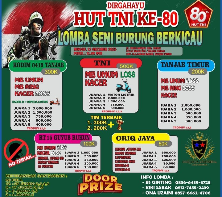 RT 15 RW 01 Kelurahan Talang Babat Kecamatan Muara Sabak Barat Kabupaten Tanjab Timur, akan menggelar Lomba Kicau Burung dalam rangka memeriahkan HUT TNI yang ke 80 tahun 2025.