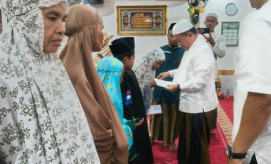 Selain melaksanakan ibadah berjamaah, Gubernur Al Haris juga menyerahkan santunan dan bantuan sembako kepada anak yatim dan kaum dhuafa.