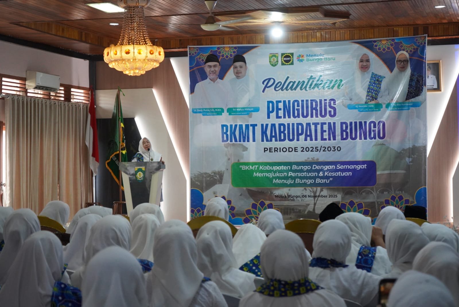 RJ.COM – Ketua TP-PKK Provinsi Jambi yang juga Ketua Pengurus Wilayah Badan Kontak Majelis Taklim (PW BKMT) Provinsi Jambi, Hj. Hesnidar Haris, SE atau Hesti Haris, melantik Pengurus Daerah BKMT Kabupaten Bungo periode 2025–2029. Pelantikan berlangsung di Wisma PP Alisudin, Rumah Dinas Bupati Bungo, Kamis (6/11/2025).