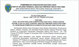 Hasil Seleksi Administrasi, Pemkab Batang Hari Umumkan Nama-nama Calon Pejabat di Tiga OPD
