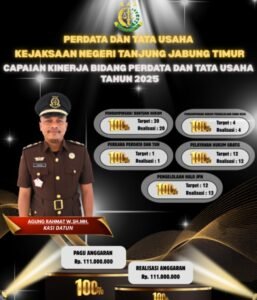 Sepanjang tahun 2025, Kejari Tanjab Timur mencatat berbagai capaian signifikan di seluruh bidang, seperti di Bidang Pembinaan berhasil merealisasikan Penerimaan Negara Bukan Pajak (PNBP) sebesar Rp2.219.922.012, atau 580,94 persen dari target Rp382.125.000.