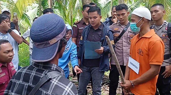 Rekonstruksi tersebut dilaksanakan langsung di lokasi perkebunan kelapa, tepat di tempat ditemukannya korban dalam kondisi tidak bernyawa beberapa waktu lalu.
