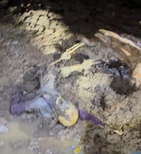 Dari hasil sementara di lapangan, kondisi jenazah sudah berupa kerangka. Saat ditemukan, kerangka tersebut masih mengenakan baju lengan panjang berwarna abu-abu dengan lengan berwarna ungu.